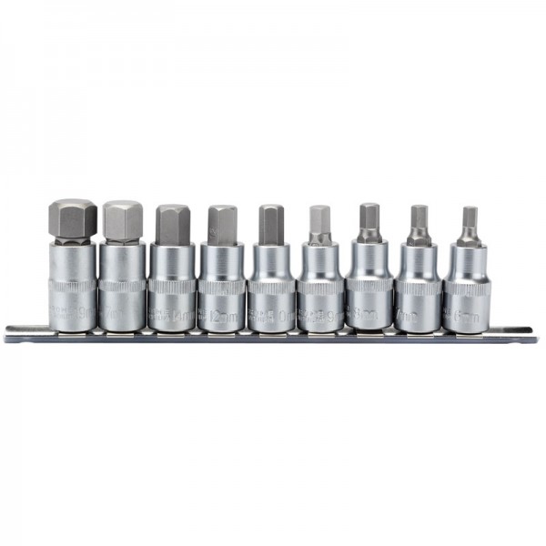 Expert Quality, 9 socket fitted with hex insert bits. All socket manufactured from hardened and tempered chrome vanadium steel with sand blasted bits of S2 silicon steel. Each socket has a knurled ring for extra grip. Supplied on a steel socket retaining rail.