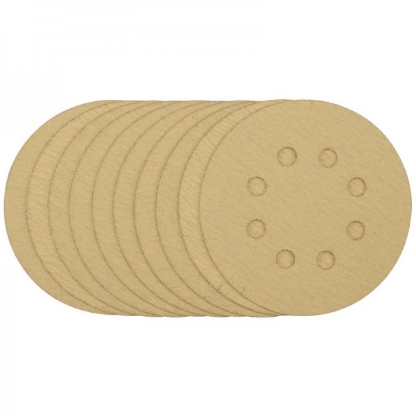 Pack of 10 gold sanding discs made from aluminium oxide with a special treatment of calcium stearate which is resin bonded to provide self-sharpening and anti-clogging performance. The heavy-duty D-Weight backing paper makes the sanding disc more durable - able to withstand the toughest jobs. The hook and loop backing offers decent adhesion to facilitate the fast changing of sanding discs. The eight pre-punched 8mm holes improve the dust extraction during sanding. Ideal for sanding and finishing wood, metals - including ferrous alloys, painted surfaces, varnish, plastic and fillers. Compatible with all 125mm random orbit sanders with a hook and loop backing pad, including Draper Stock No. 58097 and 89522.