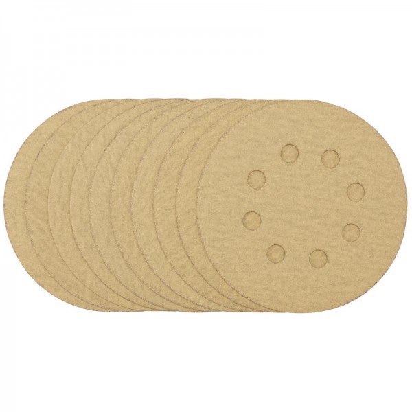 Pack of 10 gold sanding discs made from aluminium oxide with a special treatment of calcium stearate which is resin bonded to provide self-sharpening and anti-clogging performance. The heavy-duty D-Weight backing paper makes the sanding disc more durable - able to withstand the toughest jobs. The hook and loop backing offers decent adhesion to facilitate the fast changing of sanding discs. The eight pre-punched 8mm holes improve the dust extraction during sanding. Ideal for sanding and finishing wood, metals - including ferrous alloys, painted surfaces, varnish, plastic and fillers. Compatible with all 125mm random orbit sanders with a hook and loop backing pad, including Draper Stock No. 58097 and 89522.