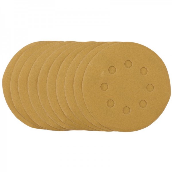 Pack of 10 gold sanding discs made from aluminium oxide with a special treatment of calcium stearate which is resin bonded to provide self-sharpening and anti-clogging performance. The heavy-duty D-Weight backing paper makes the sanding disc more durable - able to withstand the toughest jobs. The hook and loop backing offers decent adhesion to facilitate the fast changing of sanding discs. The eight pre-punched 8mm holes improve the dust extraction during sanding. Ideal for sanding and finishing wood, metals - including ferrous alloys, painted surfaces, varnish, plastic and fillers. Compatible with all 125mm random orbit sanders with a hook and loop backing pad, including Draper Stock No. 58097 and 89522.