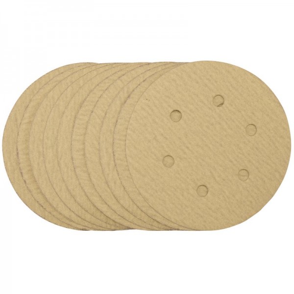 Pack of 10 gold sanding discs made from aluminium oxide with a special treatment of calcium stearate which is resin bonded to provide self-sharpening and anti-clogging performance. The heavy-duty D-Weight backing paper makes the sanding disc more durable - able to withstand the toughest jobs. The hook and loop backing offers decent adhesion to facilitate the fast changing of sanding discs. The six pre-punched 8mm holes improve the dust extraction during sanding. Ideal for sanding and finishing wood, metals - including ferrous alloys, painted surfaces, varnish, plastic and fillers. Compatible with all 150mm random orbit sanders with a hook and loop backing pad, including Draper Stock No. 65084, 83942 and 84125.