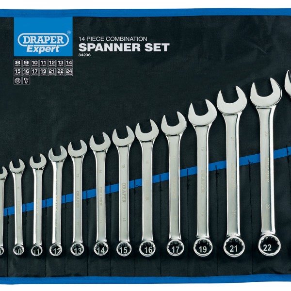 Forged from chrome vanadium steel hardened, tempered and chrome plated for corrosion protection. Draper HI-TORQ® ring end offset at 15°. Jaw offset at 15°. Supplied in vinyl divided wallet with tie cord.