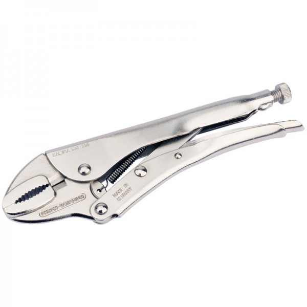 Professional Quality, curved pattern jaw pliers with wire cutter, drop forged from chrome vanadium steel hardened, tempered and nickel plated. Jaws have serrated gripping surface and adjustable opening with quick action release lever. Sold loose.