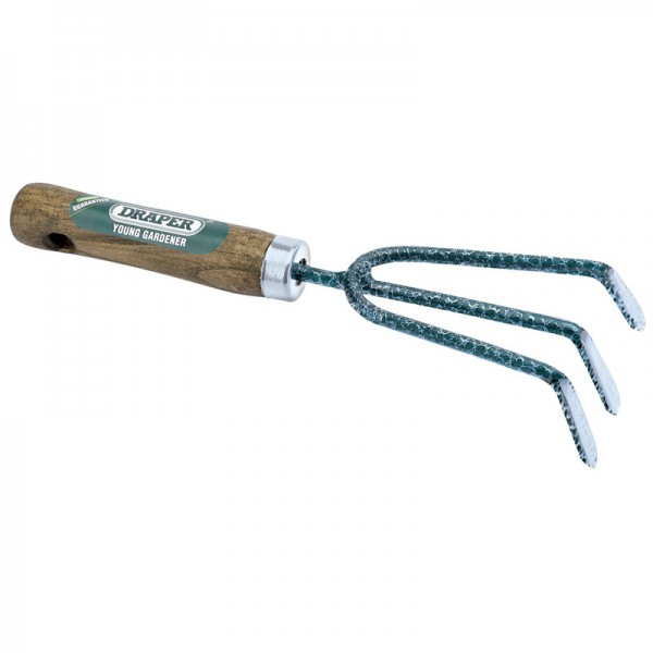 Carbon steel hand cultivator designed for the young gardening enthusiast, correctly hardened and tempered with lacquered ash handle and wrist strap. Sold loose.