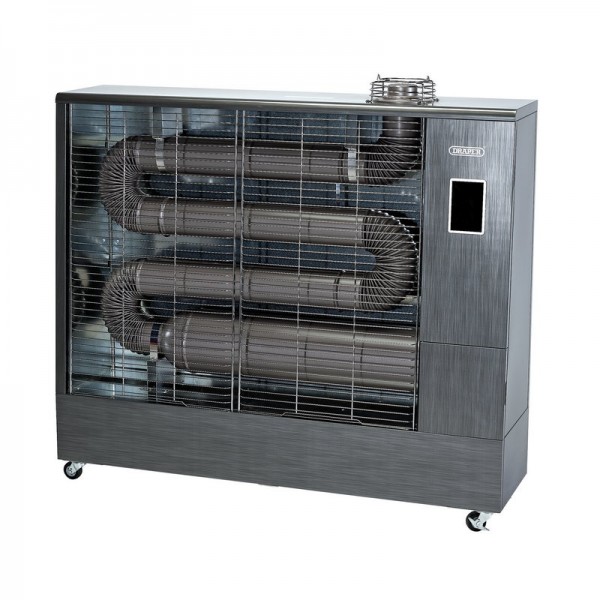 This indirect far infrared diesel heater with flue kit features a remote control and digital thermostat for easy heat control. It is economical, low noise, almost completely odourless and highly cost efficient to run. This heater consumes only 50W of electricity to keep the burner operating and it consumes as little as 1.7 litres of diesel fuel per hour. Unlike traditional fan heaters, infrared heat spreads evenly in all directions. Designed for heating spaces of approximately 110m2. Can be used in well-ventilated areas such as garages, barns, workshops, warehouses and marquees. The flue kit supplied allows for a more permanent installation and must be used for enclosed indoor areas (not well-ventilated). The LED control panel features a 24-hour timer and full thermostatic control, all conveniently operated by the remote control. It is fitted with wheels for manoeuvrability.